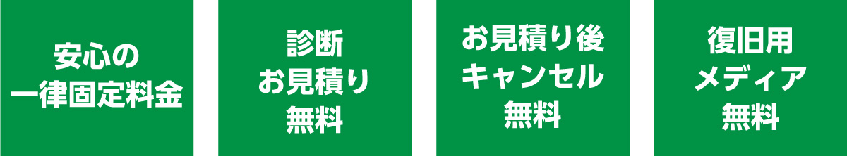 当社のデータ復旧サービスは、お客様に安心してご利用いただけるよう、3段階の障害レベルを設定し、一律固定料金制にてご注文を承っています。必ず事前にメディアの診断を行い、障害レベルとお見積りをご提示し、ご納得いただいてから作業を行います。診断・お見積りは無料で、お見積り後に作業を行わない場合もキャンセル料はいただきません。復旧用のメディアの代金も復旧料金に含まれており、作業後に追加料金が発生する心配がありません。