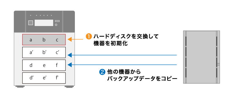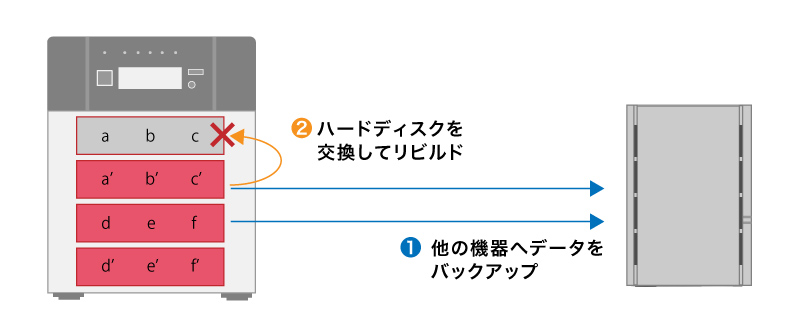 この方法は、リビルド中に複数のHDD/SSDが故障し、リビルドできなくなった場合に有効です。故障していないHDD/SSD以外も長期間使用している場合は、リビルドを行わずにすべて新しいHDD/SSDに交換して、コピーによって復旧するのもひとつの方法です。