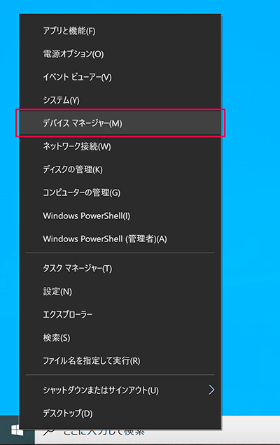 ①画面左下のWindowsマークを右クリックして、デバイスマネージャーを選択します。
