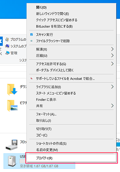 ①エクスプローラーで外付けSSDを表示し、右クリックして、「プロパティ」を選びます。