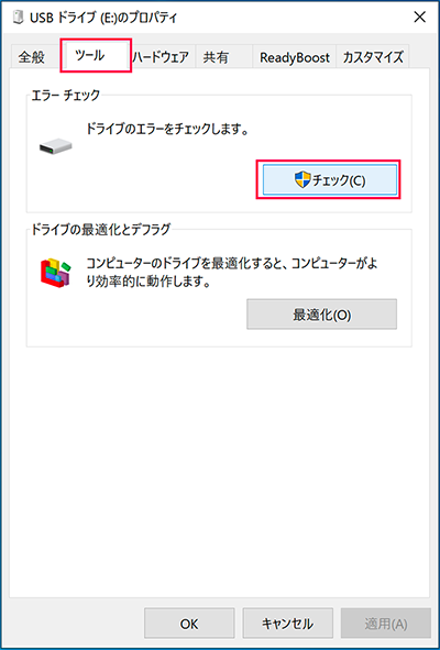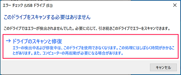 ③ドライブのスキャンと修復をクリックすると、エラーチェックと修復が実行されます。