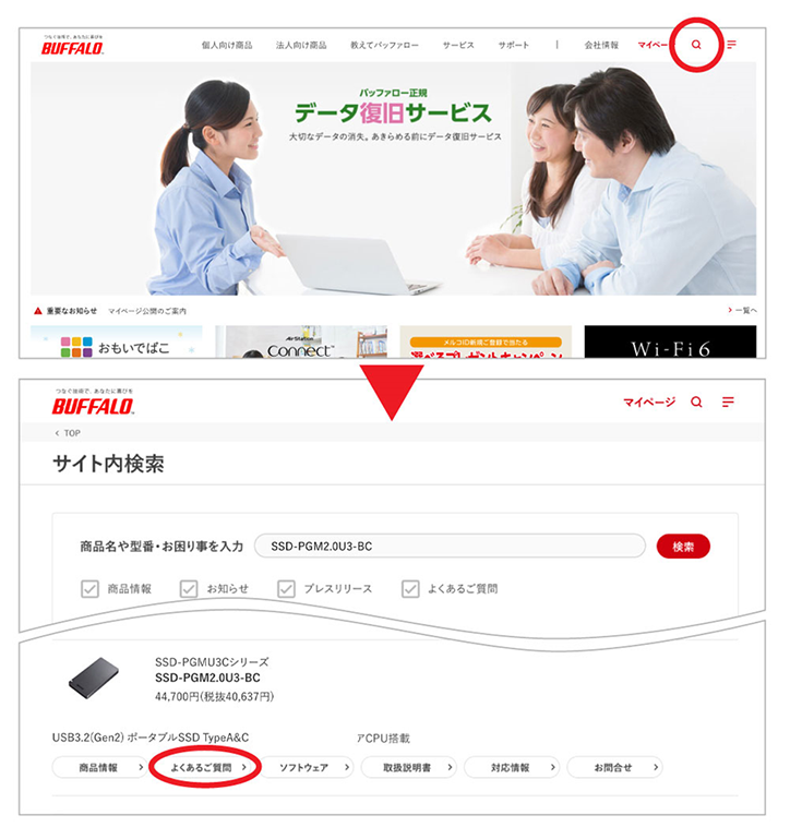 バッファロー公式サイトには、製品サポート情報が掲載されています。トップページの右上にある虫めがねマークをクリックし、商品の型番を入力・決定し、表示された製品ページの「よくあるご質問」をクリックすると、トラブル解決や設定手順などの情報をご確認いただけますので、当社製品をご利用の方はぜひご利用ください。