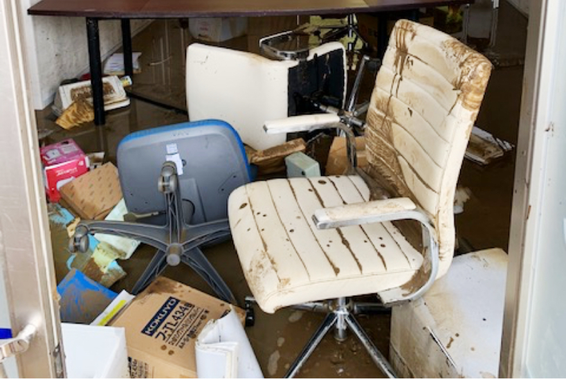 2020年7月に発生した大雨により被災。オフィスの2/3が水没し、付近の車は浮いて流れているような状況でした。報道で豪雨による水害を見ていましたが、まさか自分が経験するとは夢にも思っていませんでしたね。